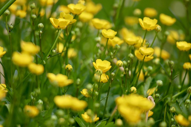 風が吹くと花が揺れる。緑の野に咲く黄色のきんぽうげ。小さな花は笑いをこらえる少女のように身をふるわせる。野に透明な笑いが満ちる。いつまでも聞いていたいような心地よい笑い。射し始めた日差しが黄色を鮮やかに浮かび上がらせる。