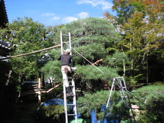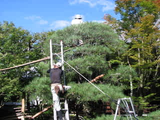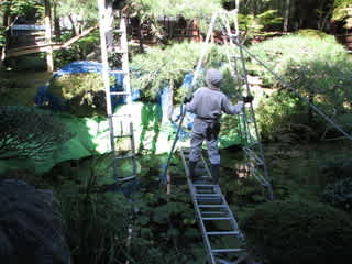 池のそばの松の木の手入れに、はしごを池の中に立てたりするんだねえ。竹とひもで固定して。