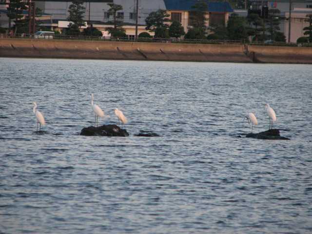 桟橋に青鷺。前に来た時も鷺を見たな。松江は鷺なんだな。