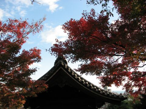 降りる時、石段から撮った拝殿の屋根と紅葉。色がちょっとなー。