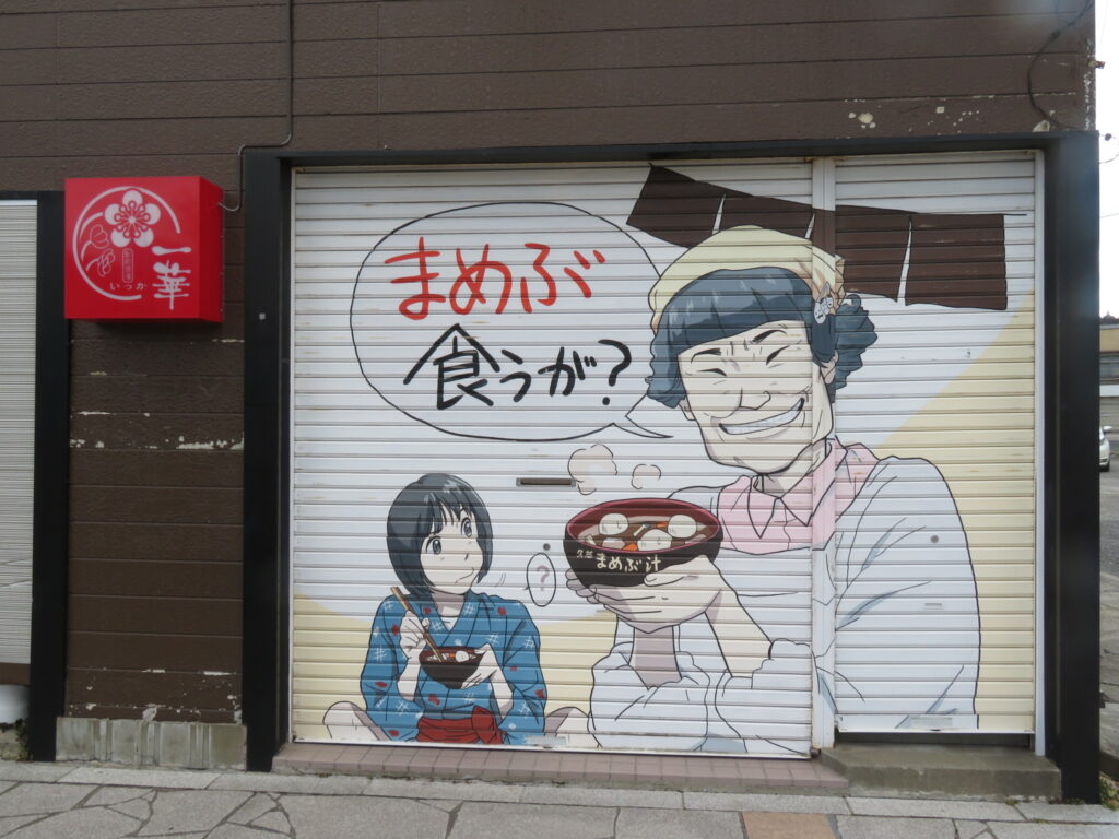 途中のシャッターに描かれた絵が上手ー。