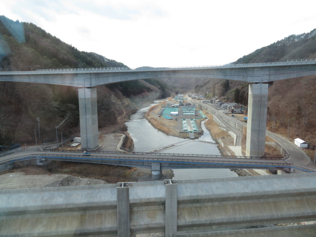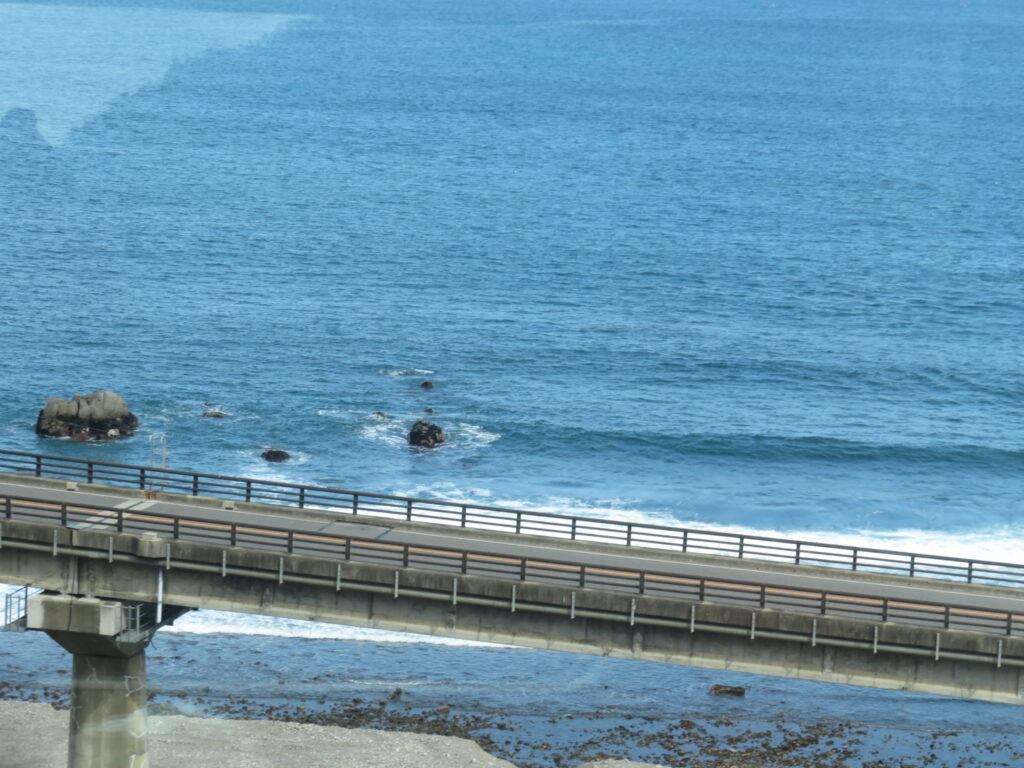 ここねえ。名前聞き洩らしたんですけど、最寄り駅が堀内駅だったっぽいので、おそらく安家川(あっかがわ)橋梁だと思います。ここで少し電車は止まってくれたんだったかな?どうだったかな?