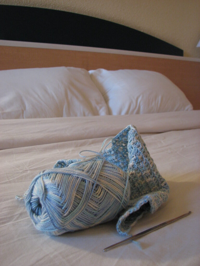 結果的に、旅行中に3玉分編めたのかな。前身頃の3分の2くらいが編めたことになるので、