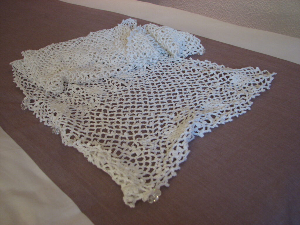 出来あがったものは編み地が厚く、夏向きではないので(半袖なのに……)、