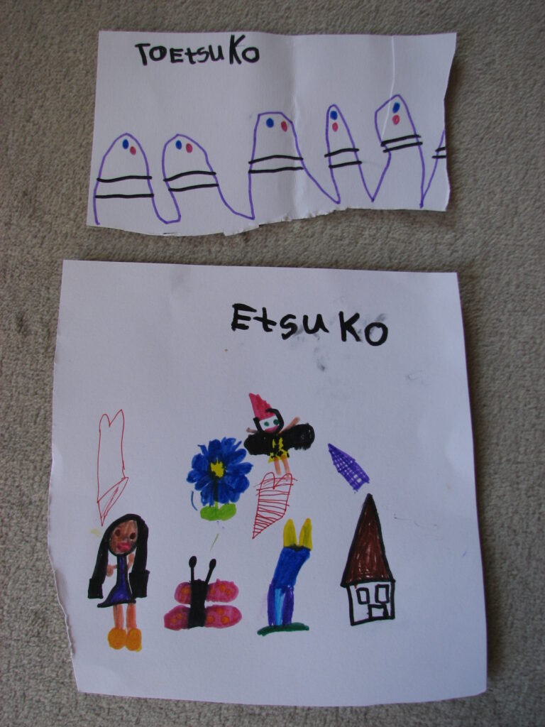 お絵描きが好きで、蝶を描くので「蝶が好きなの?」と訊いたら「イエス」。