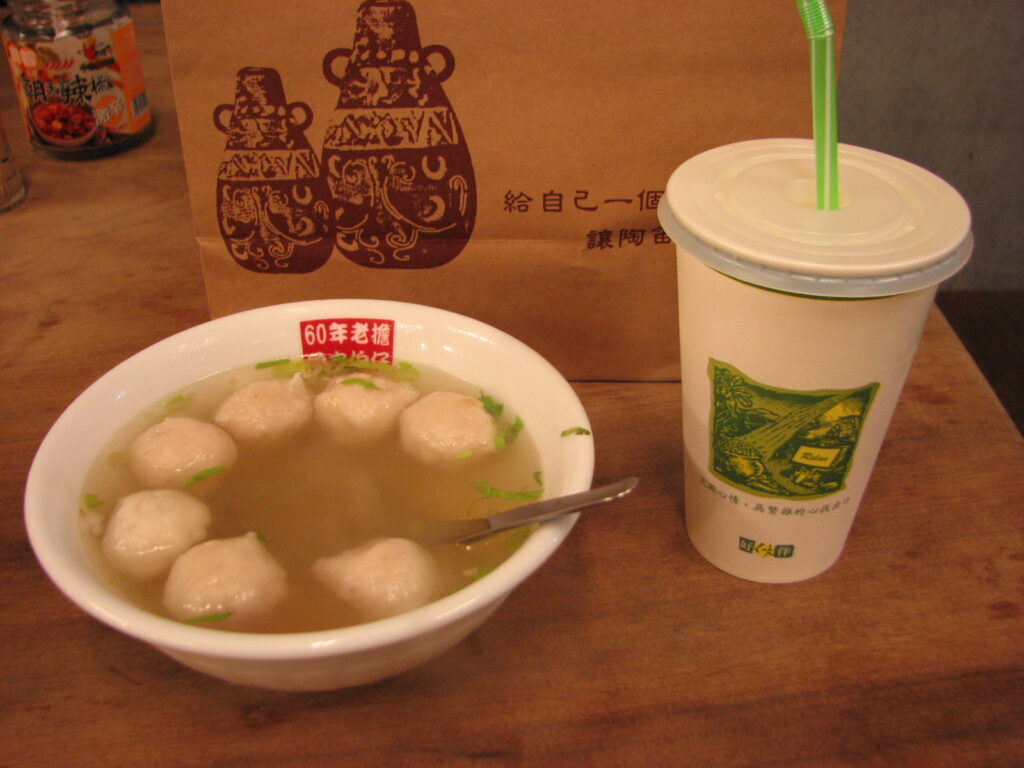 夕食は魚丸湯というスープと杏仁茶(杏仁豆腐を液体状にしたもの)。