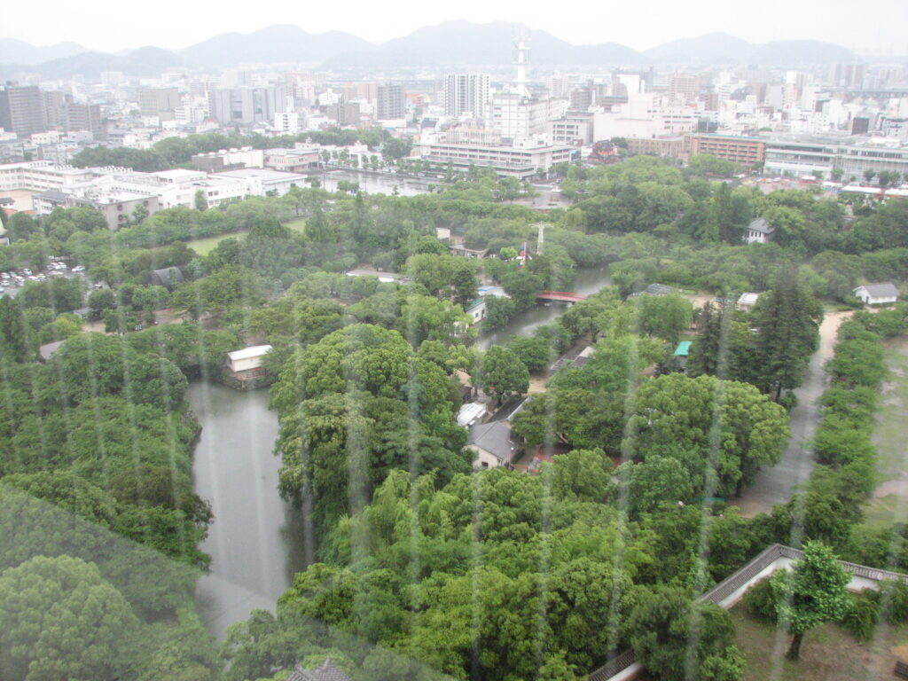 写り込みが激しいが、天守の高さからの眺望。
