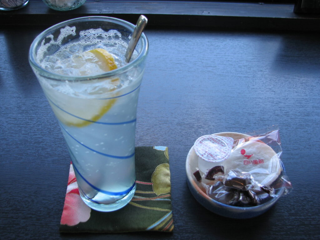 レモンスカッシュを頼みました。小皿のお菓子が大変にウレシイ(^o^)。