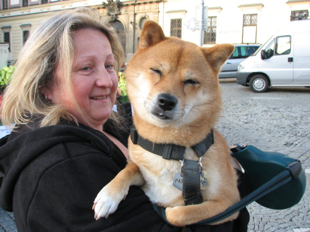 飼い主の人が伏せた犬を無理やり抱き上げて移動しようとしたところで声をかけて、撮影。