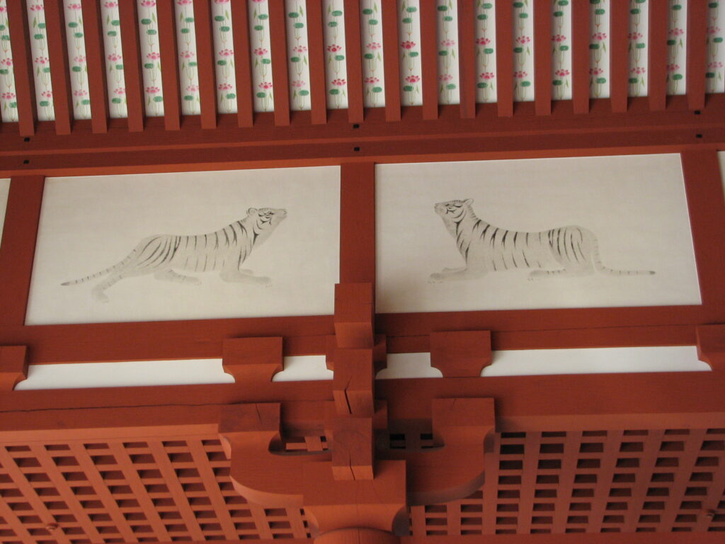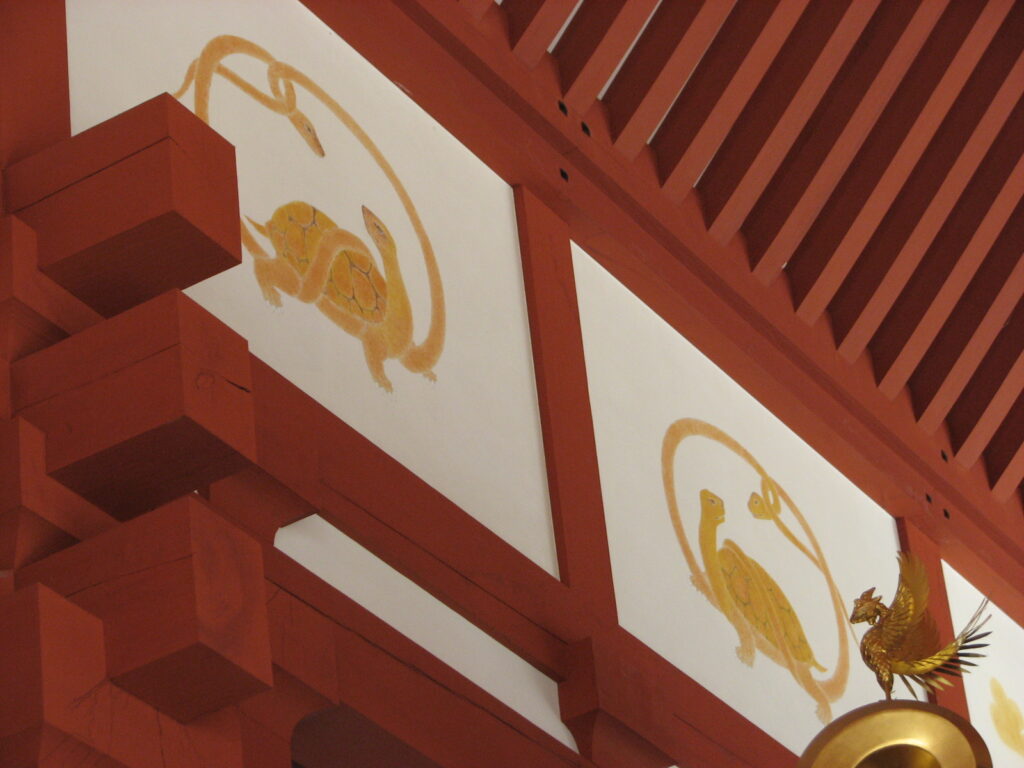 四神。南の朱雀(←雉にしか見えないが)、西の白虎、北の玄武。装飾のわりにちょっと地味目ですな。