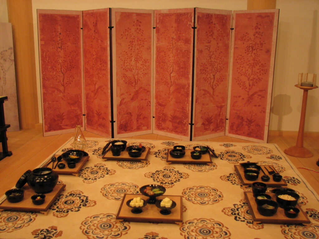 お食事風景。足つき膳ではなく、置き場所が低いだけで、途端に遊牧民族の食卓に見えてくる。