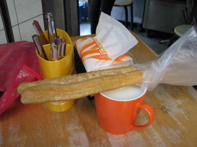 あったかい杏仁茶に油条。パリパリのお麩のようなもの。浸して食べます。