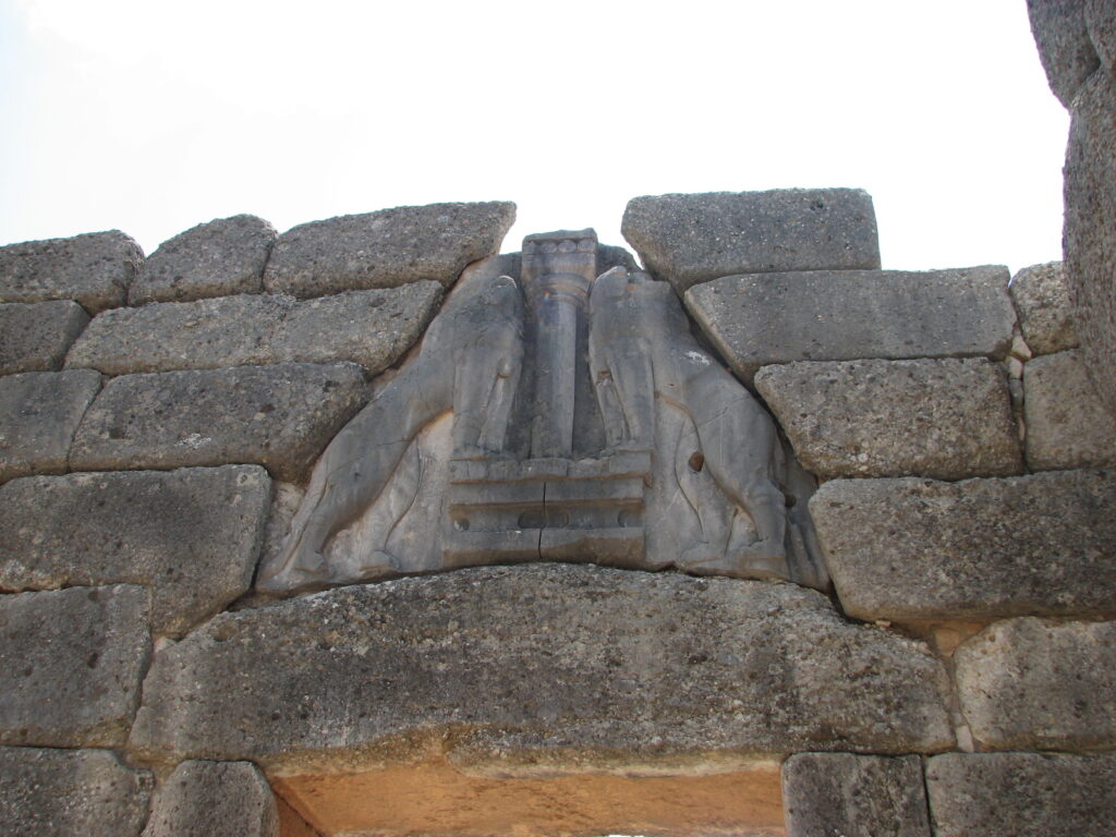 獅子門。出入り口の上の三角形の部分に二頭の獅子が彫られている。