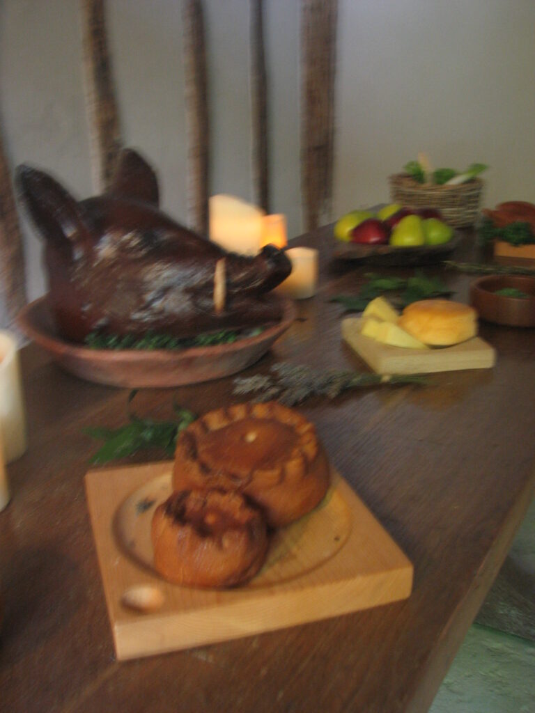 ちょっとボケてるが当時の食卓を再現したもの。豚の頭ですよ、豚の頭。これは作り物ですが。