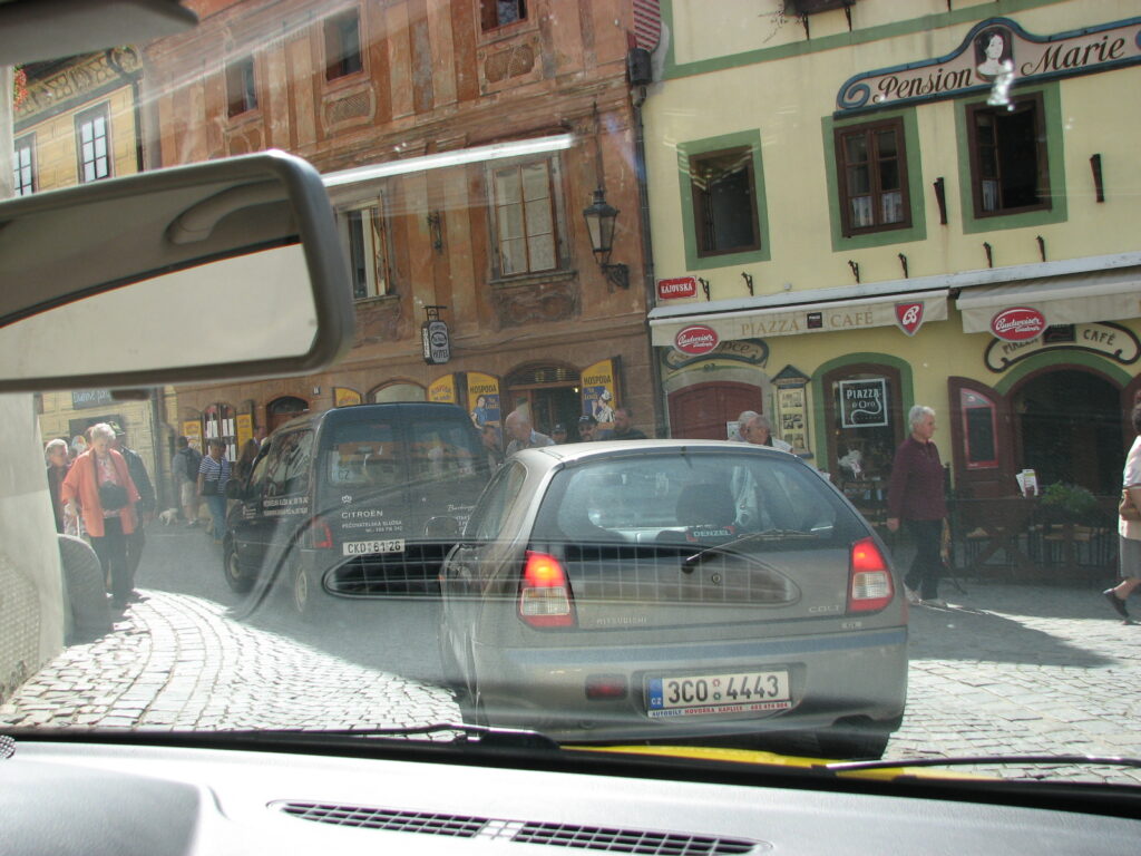 ここから見たチェスキー・クルムロフの町は絶景。……だったのだが、何しろ馬が歩く幅が、