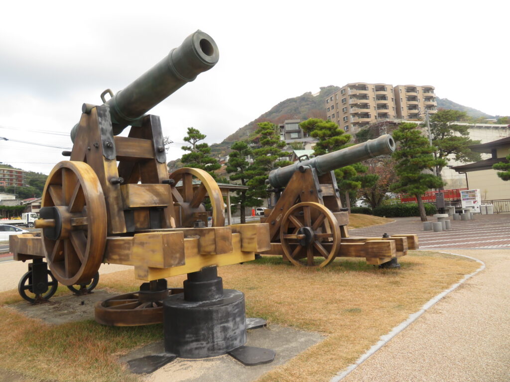 大砲とモニュメント。大砲は下関戦争時代のもの、モニュメントは源義経、平知盛です。手前が知盛。