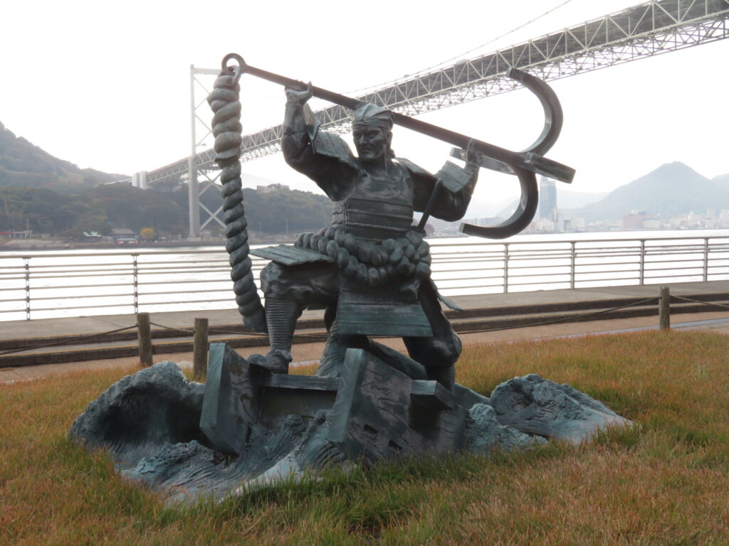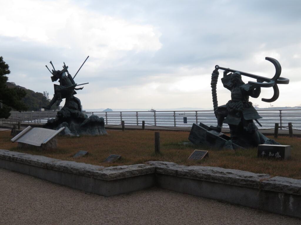 モニュメントの方は、……義経と知盛を組み合わせるのは若干疑問。義経の八艘飛びは平教経相手だし。義経は身軽で、教経に追われた時に船から船と飛び移った逸話はあるけど、それが八艘だったかは未詳。