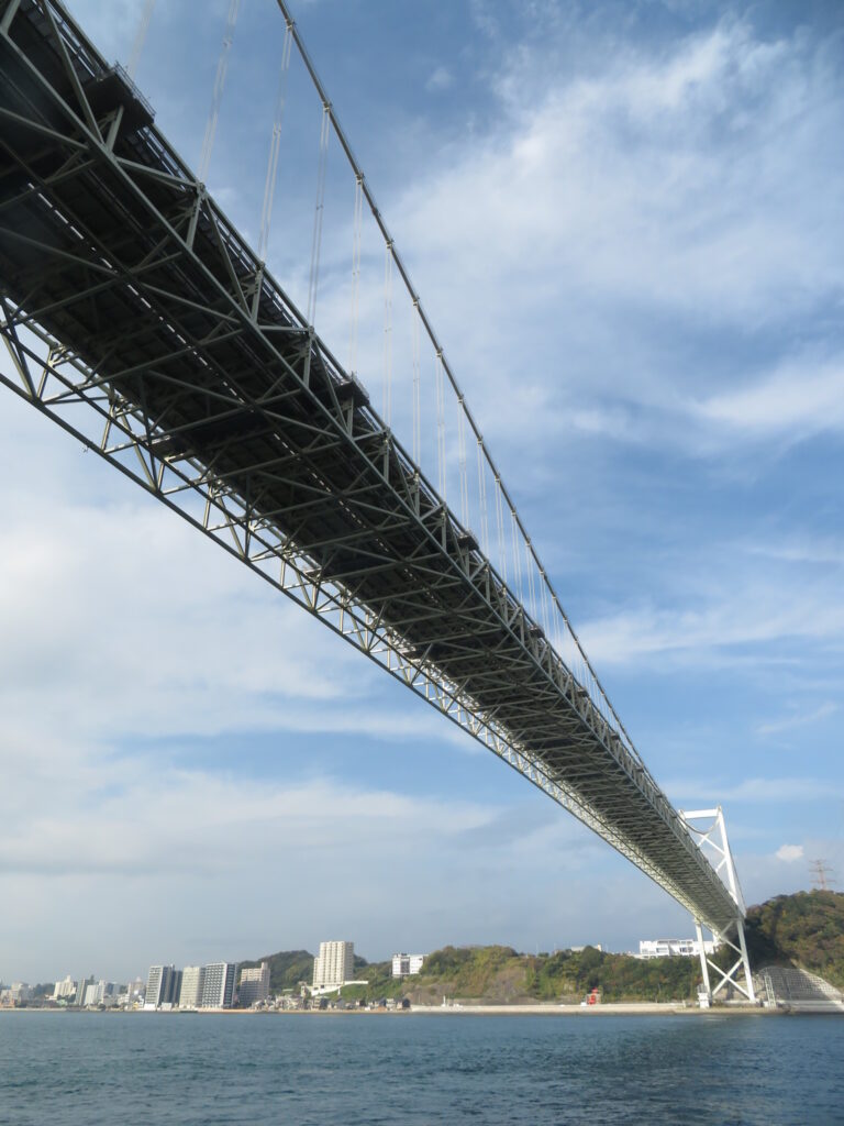 いやもうてっきり歩いて渡れるもんだと思い込んでたよ。鳴門大橋と同じようになっているイメージだった。むしろこんなに大きな橋が車専用ということが意外。そういえば、電車が走りそうな部分も見えないな……。