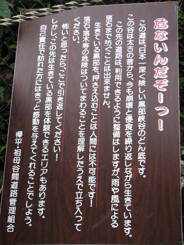 しかし奥鐘橋をすぎた辺りにはこんな看板が。