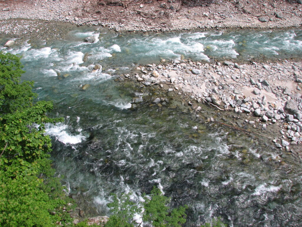 写真では色が全く出てないが……空は真っ青で、川の水はもっと白みを帯びたエメラルドのような美しい色で、