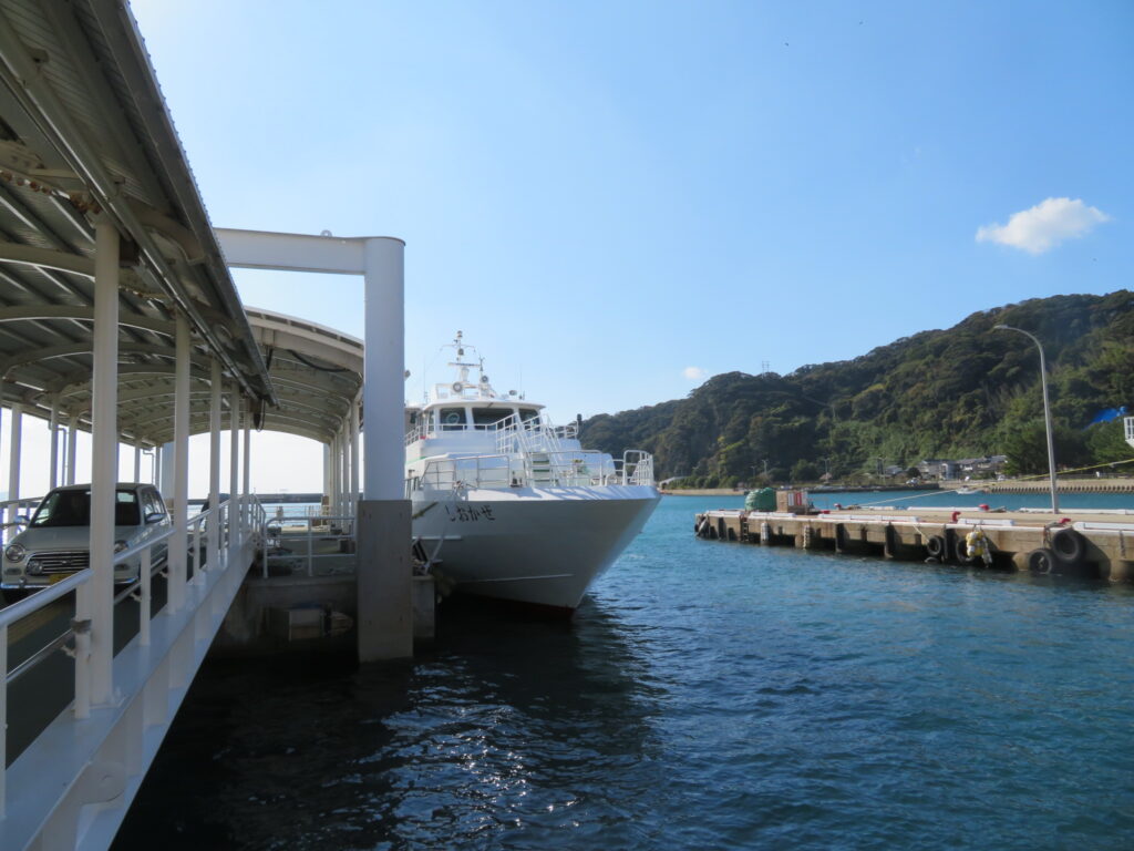 大島への船は片道570円で約20分の船旅。昨日の相島に引き続いての船。昨日の海はよっこいしょっと波を乗り越えて行く縦波だったが、今日は横波で少し船酔いする。
