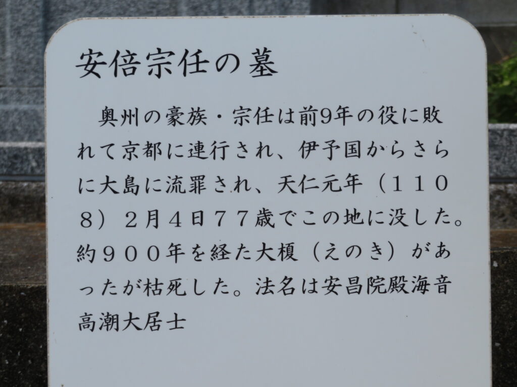 安倍宗任とは誰かというと、11世紀の奥六郡(盛岡市を中心とした周辺地域)を支配していた安倍一族の一人。安倍氏が源頼義・義家に滅ぼされた後――正確にいえばこの言い方には語弊がありますが――安倍氏の生き残りは流罪になったが、宗任(頭領の次男。一族においては参謀的な役割にあったのではないかと想像する)は伊予の国に流され、そののち宗像大島へ再配流されてそこで一生を終えた。