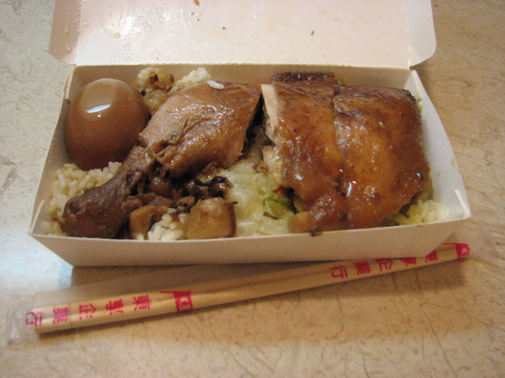 ホテルで、昼寝前と昼寝後の二度にわけて鶏もも弁当を食べる。