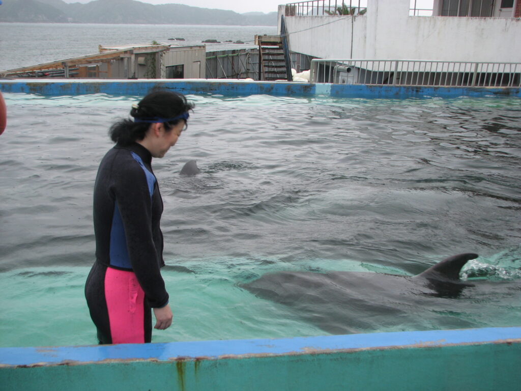 30分ほど小さいイルカたちと遊んだ後、今度は円形のプールに移動して、