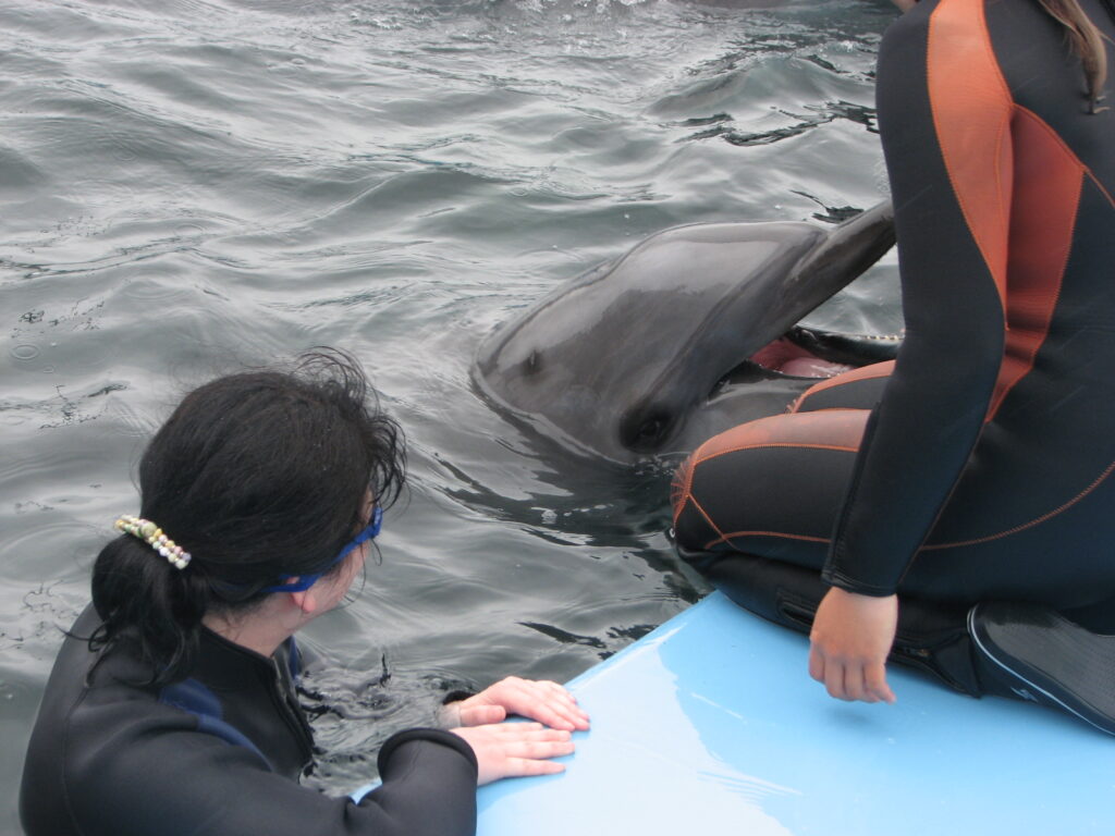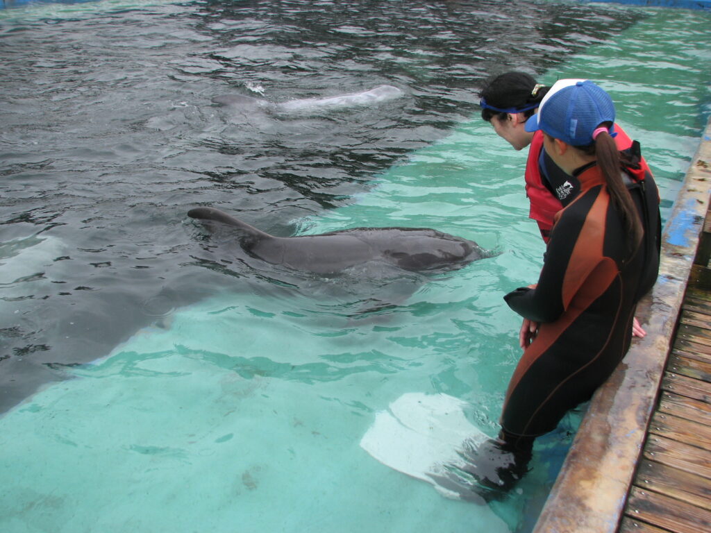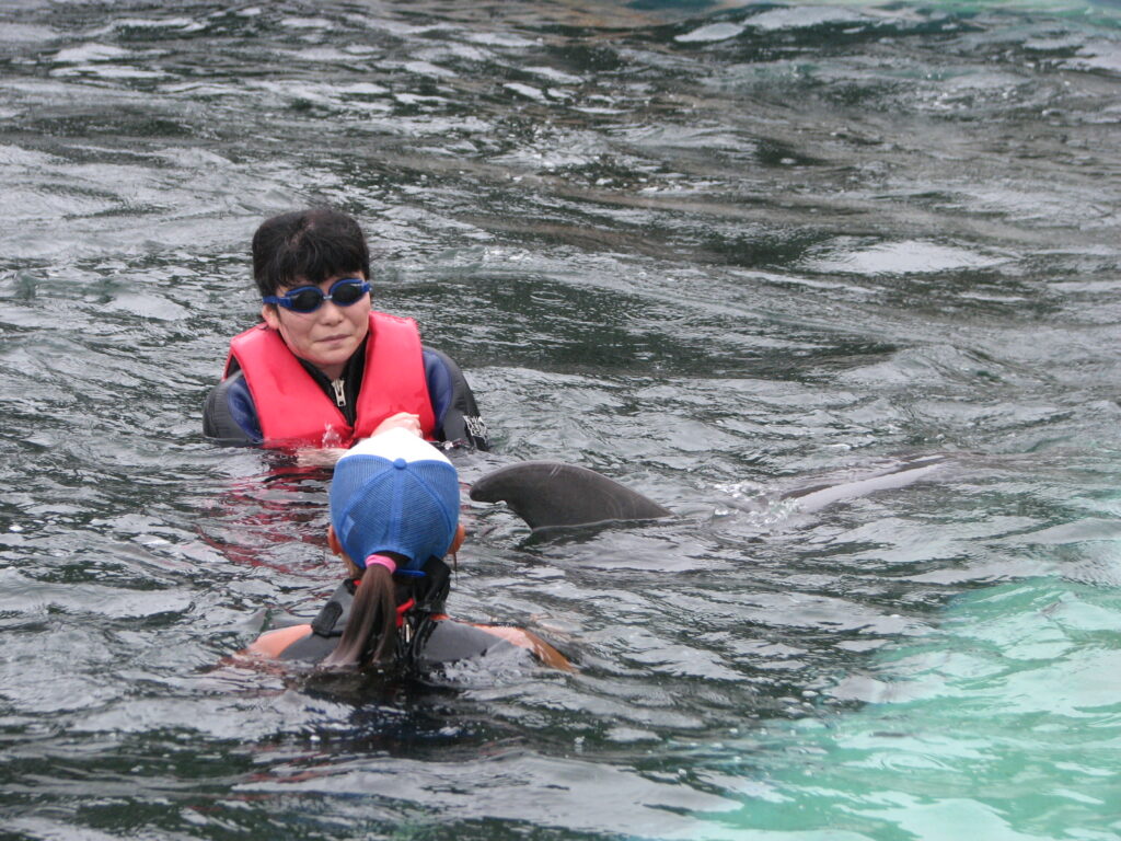 でもけっこうな速さで泳ぐイルカの、頭を触らずに胴体を撫でるというのは高等技術です。