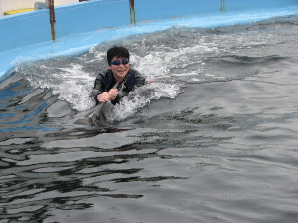 背びれにつかまらせてもらってプールを一周×2回泳ぐ。けっこうなスピード。