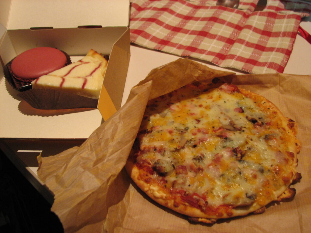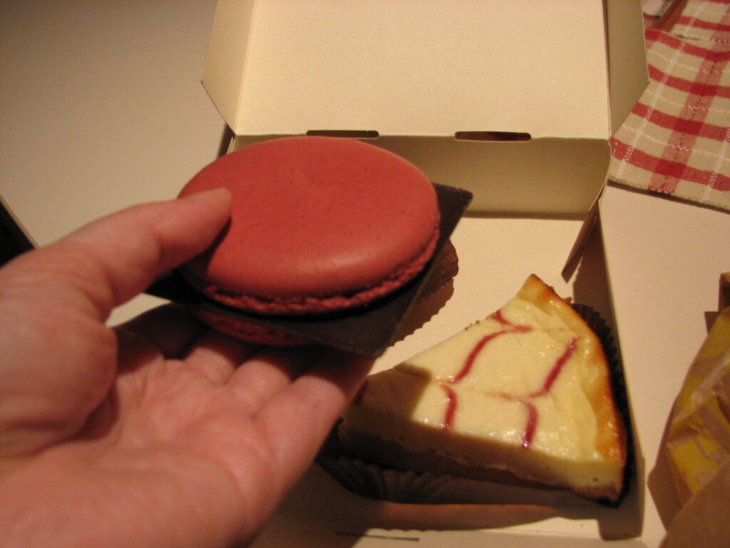 ピザとチーズケーキとマカロン。これを晩ごはんと明日の朝食にする。